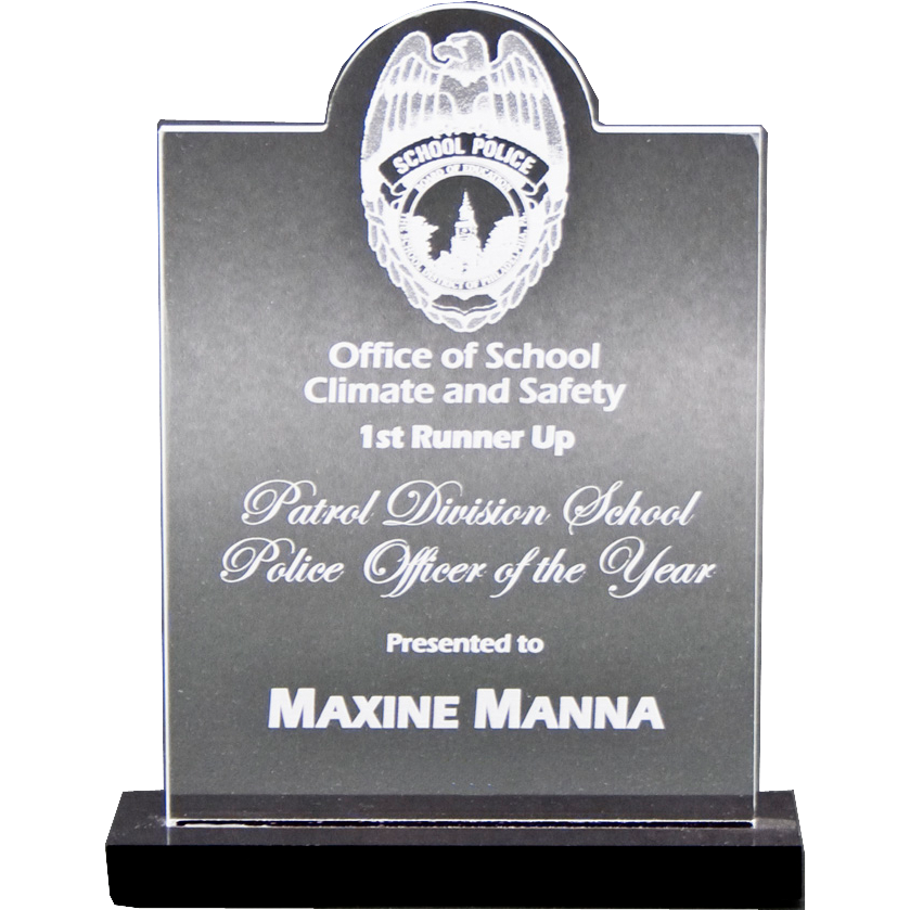 This Clear Acrylic Starfire Ball design with an ebony acrylic base is contemporary and eye-catching with its precision-cut frosted lasered personalization. Logos easily incorporated.