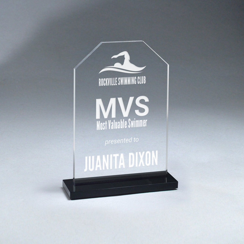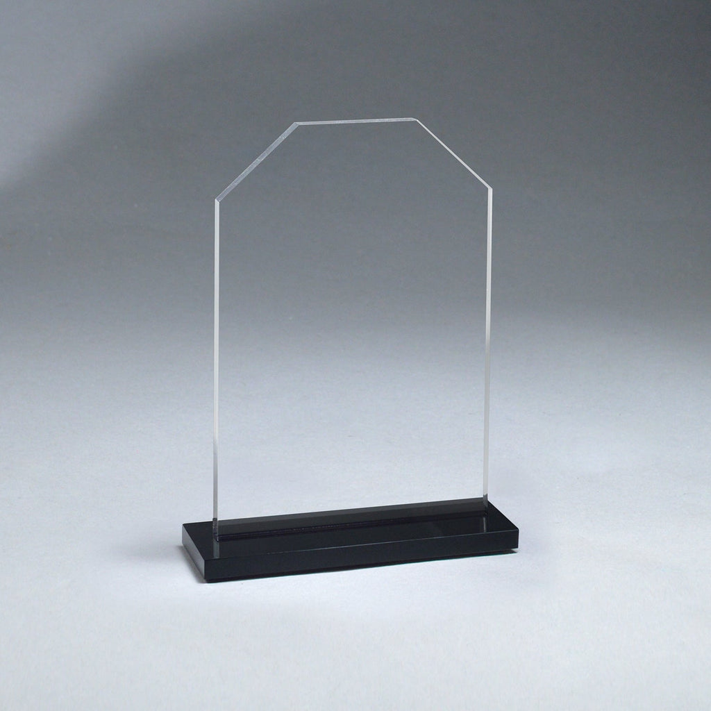 Our popular Starfire Acrylic Stone Top shaped award measures 7.5 inches. This Clear Acrylic design comes on top with an ebony acrylic base that is contemporary and eye-catching with its precision-cut frosted lasered personalization. This award can also be imprinted in full color for a truly unique presentation.Â