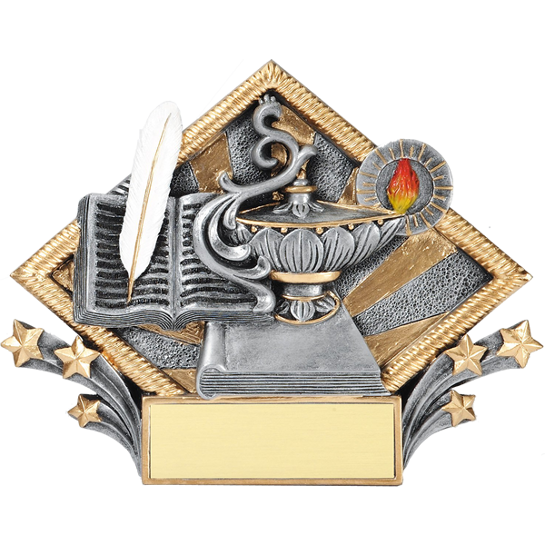 3D silverstone lamp of learning resin with gold accents. This 6" high resin can either hang on wall or stand upright. Lettered plate can be attached to the resin.