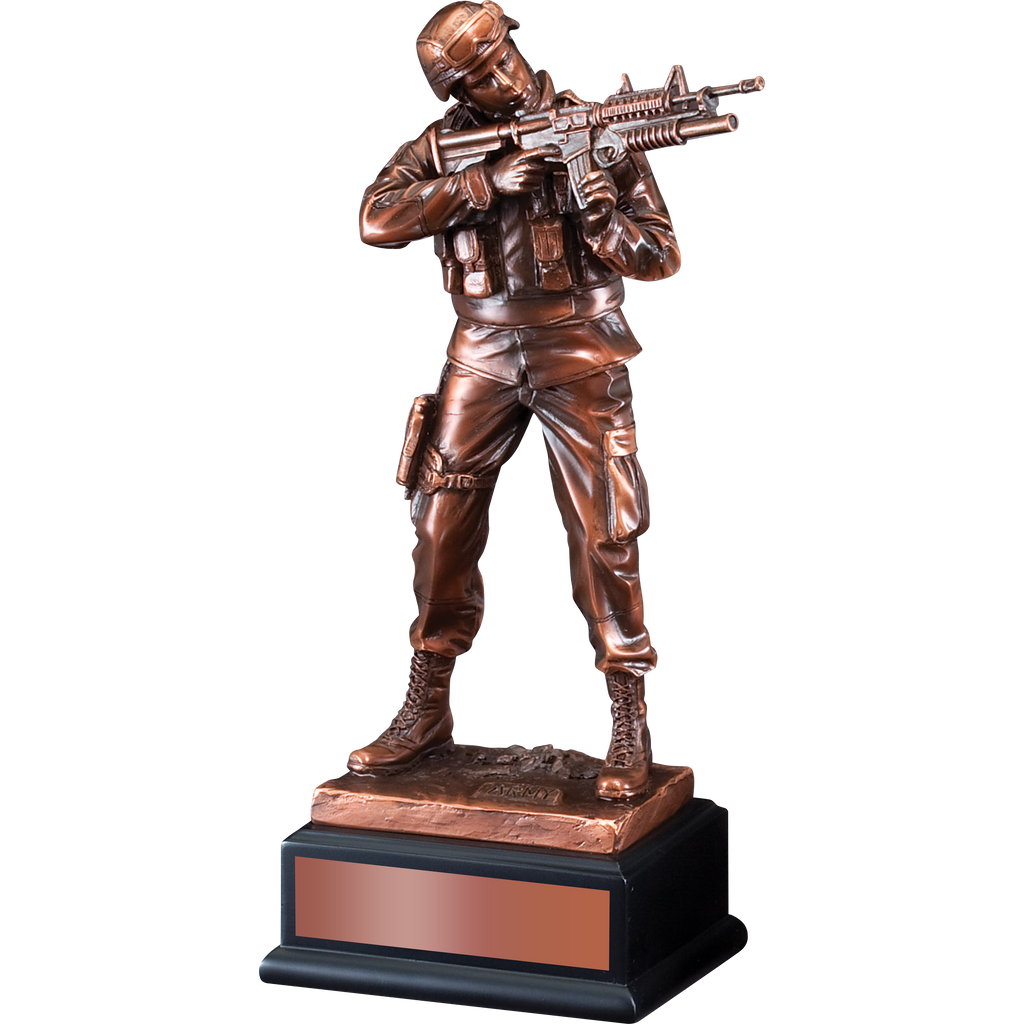 Honor the dedication and valor of our brave male soldiers with this 11.5" bronze-tone statue. Perfect for Military Recognition or as a thoughtful gift to show your gratitude to those who serve. A tangible symbol of respect and appreciation, this award captures the spirit of our nation's heroes. The plate can be imprint with your special heartfelt message.